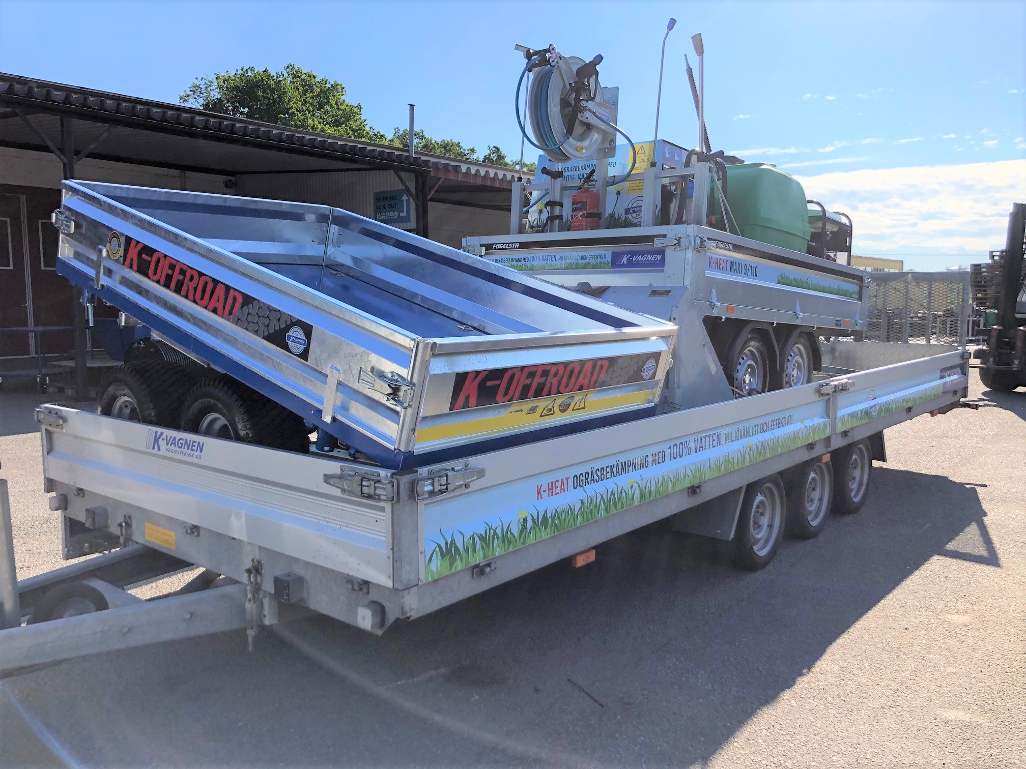 Nya maskiner på väg till växjö 👍☀️🇸🇪3 st K-offroad trevägstipp vagnar1 st K-heat MAXI 9/110 boggi vagn, fullutrustad till tvättning och ogräsbekämpning 🌱🎋🌱🍀☘️💧💦😀